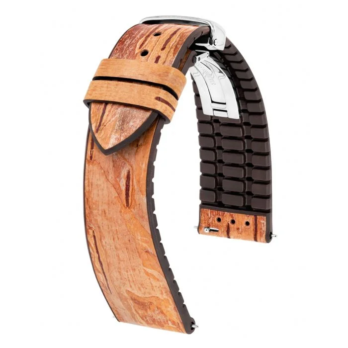 Das Modell ist 100% tierfrei und basiert ausschließlich auf pflanzlichen Stoffen. Birch ist ein Armband, dessen Oberseite aus natürlich gewachsener und feinst veredelter Birken-Rohrinde besteht. Verbunden mit einem Kern aus HIRSCH Premium Caoutchouc ergibt das ein hoch funktionelles Uhrenarmband, welches nicht nur robust ist, sondern durch die noch deutlich erkennbare Holzmaserung auch ein Eye-Catcher der besonderen Art ist.