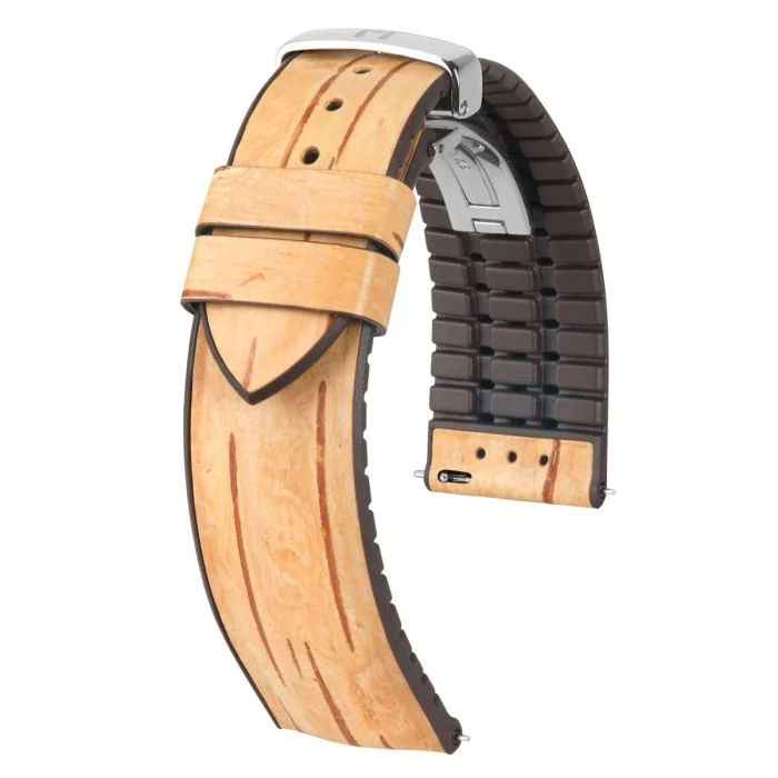 Das Modell ist 100% tierfrei und basiert ausschließlich auf pflanzlichen Stoffen. Birch ist ein Armband, dessen Oberseite aus natürlich gewachsener und feinst veredelter Birken-Rohrinde besteht. Verbunden mit einem Kern aus HIRSCH Premium Caoutchouc ergibt das ein hoch funktionelles Uhrenarmband, welches nicht nur robust ist, sondern durch die noch deutlich erkennbare Holzmaserung auch ein Eye-Catcher der besonderen Art ist.